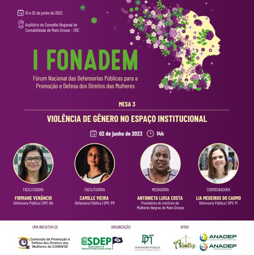O evento, uma iniciativa da Comissão de Promoção e Defesa dos Direitos das Mulheres do Conselho Nacional das Defensoras e Defensores Públicos-Gerais (Condege), vai ocorrer no auditório do Conselho Regional de Contabilidade (CRC-MT), com transmissão online simultânea no canal da Esdep-MT no YouTube.